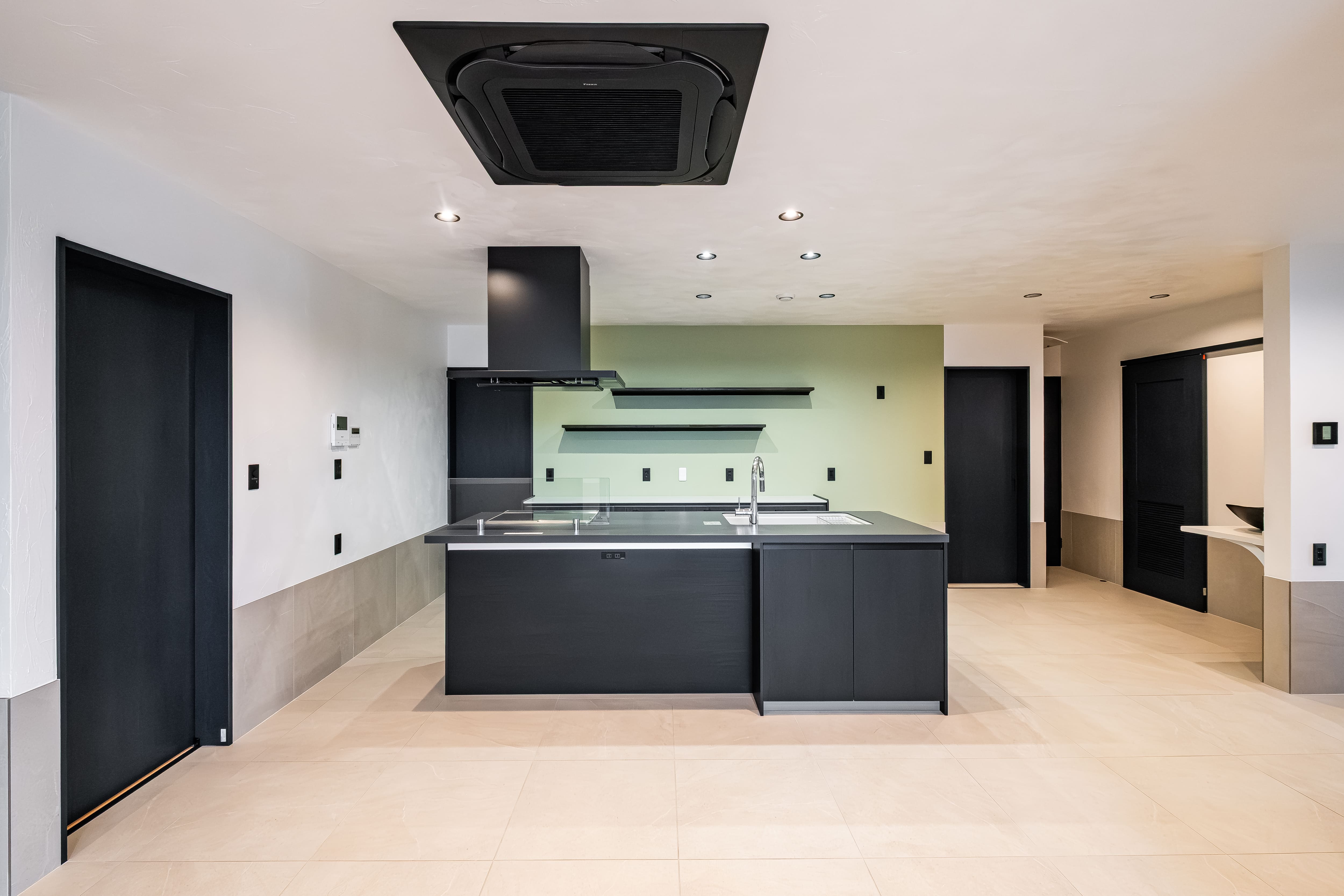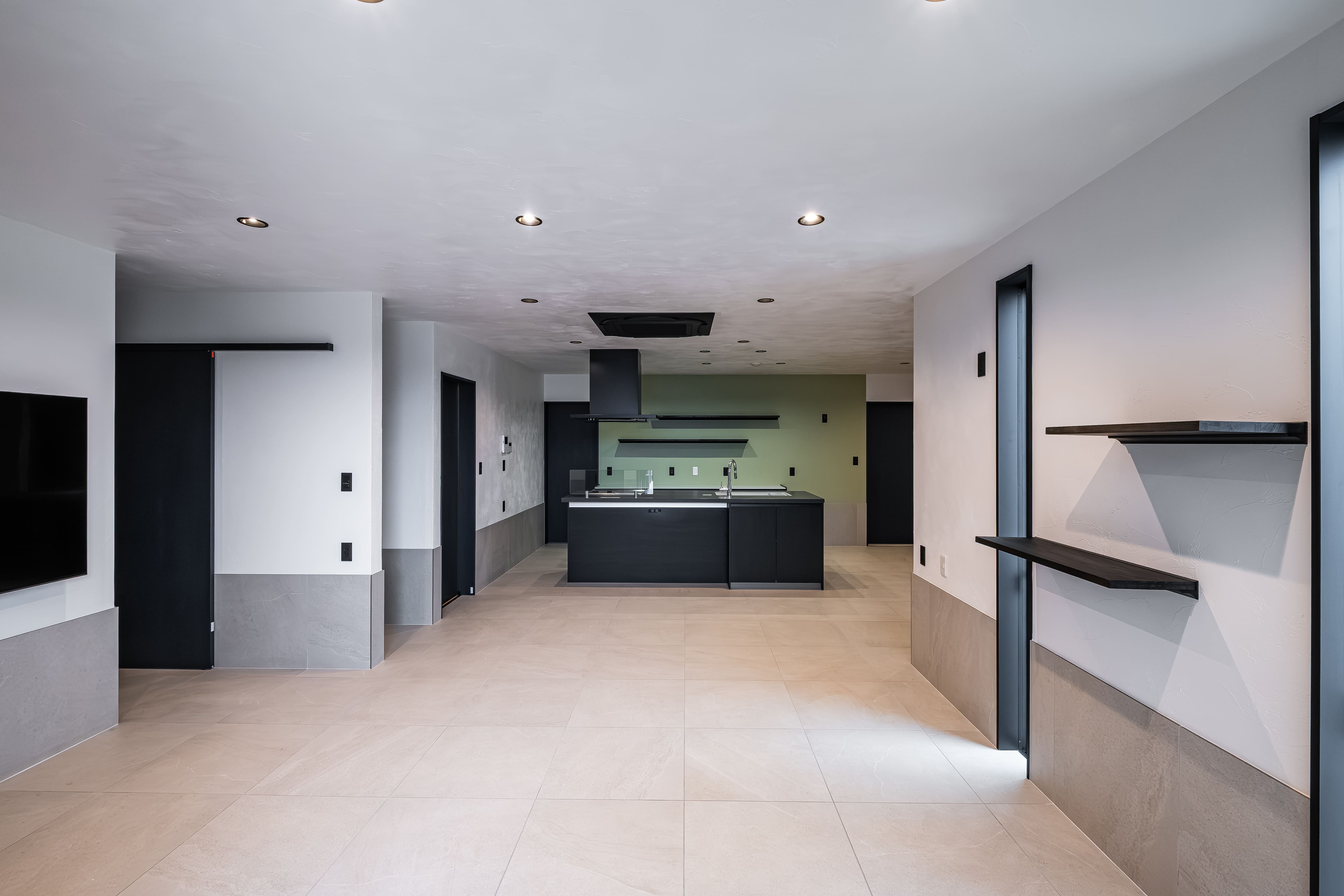 室内は、床全面をタイル仕上げに。