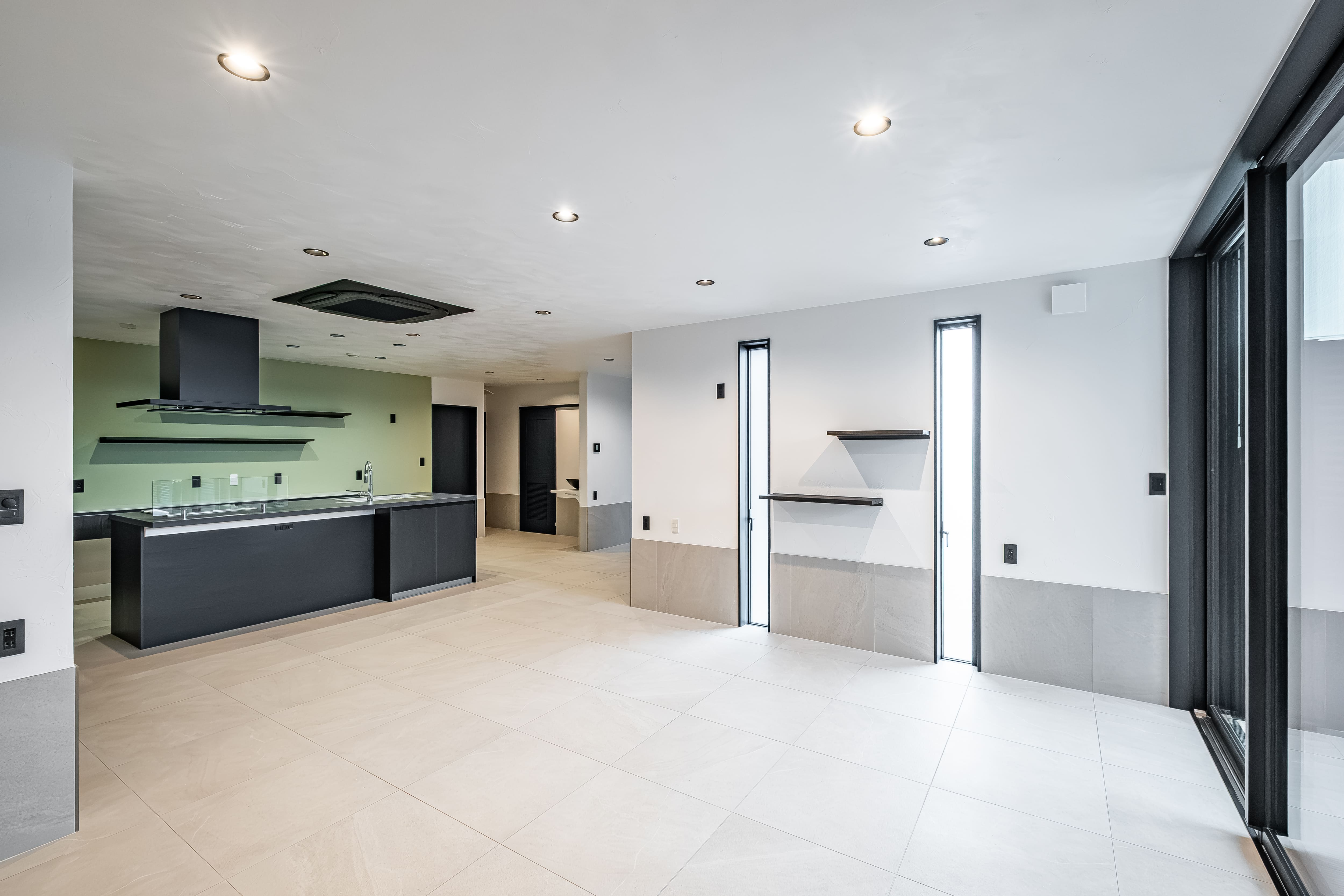 黒い外観の静かな佇まいと、室内の開放感。
