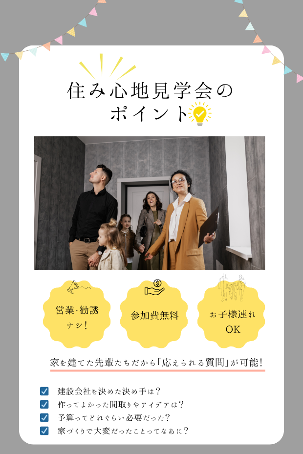 今回の「住み心地見学会」は、共働きご夫婦、子育て中のご夫婦、「和テイスト」を家に取り入れたいとご検討中の方におすすめの見学会です!