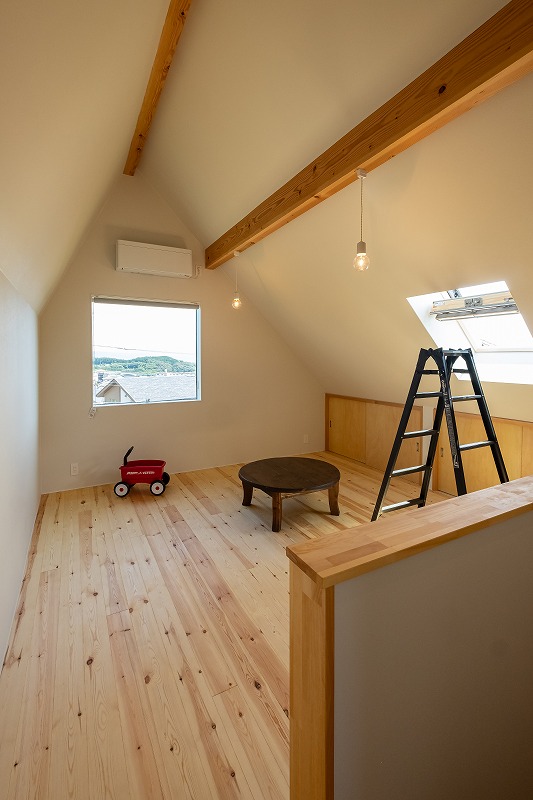平屋ならではの「高い天井」や「屋根の形を活かした斜め天井(勾配天井)」を使い、その上の空間に「ロフト」というボーナスステージを作ります。