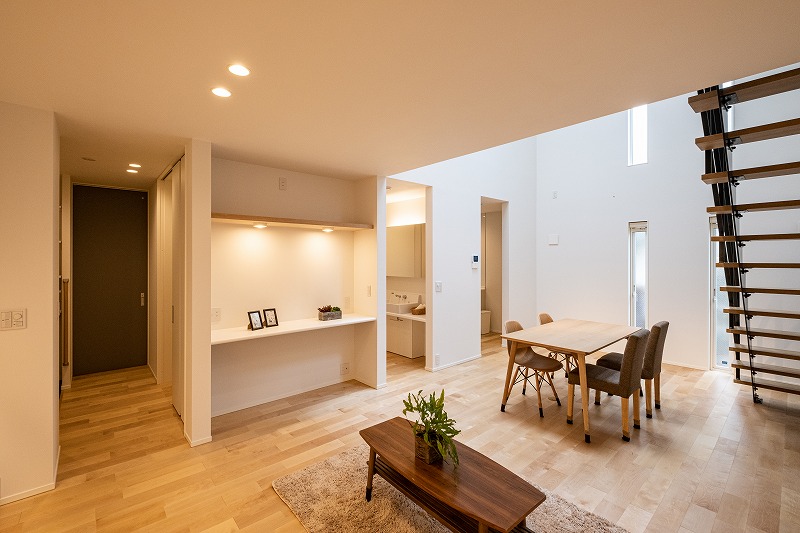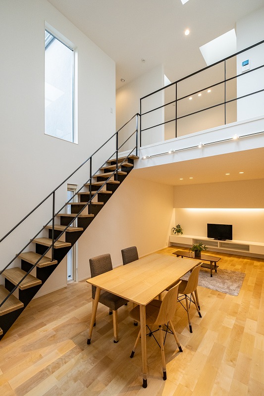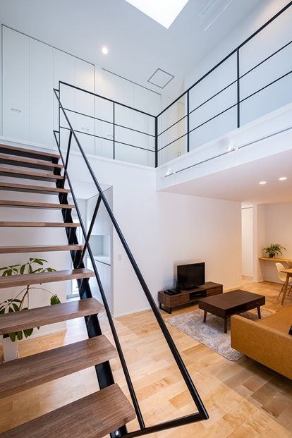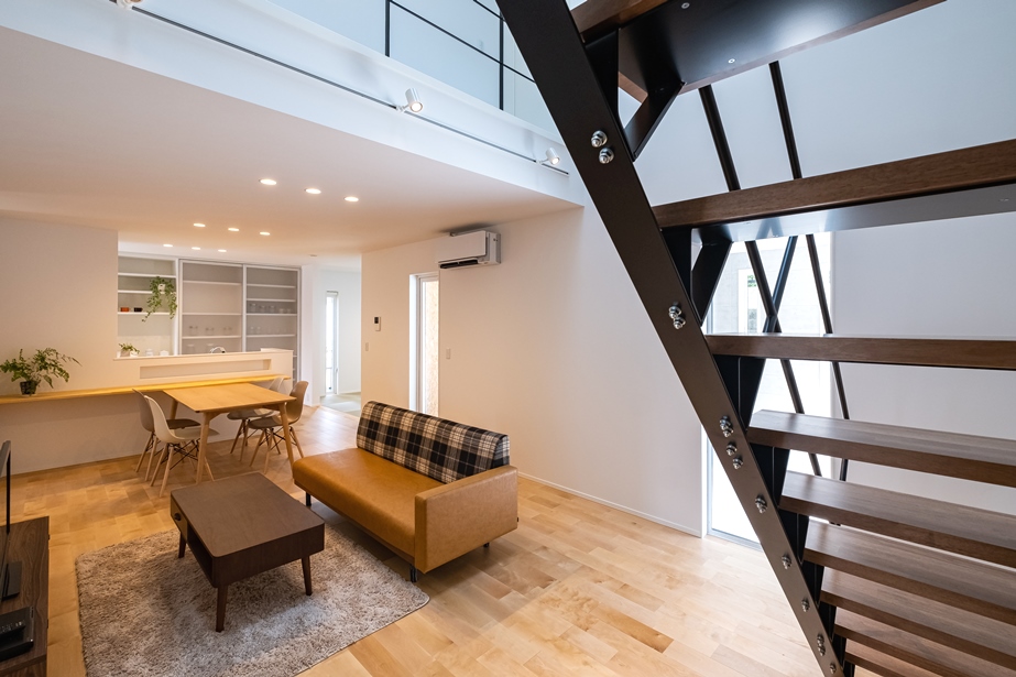 吹き抜け+スケルトン階段は上下をゆるやかに繋いでくれるので、お家のどこにいても家族を感じられます。